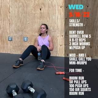 Wednesday 05/18/22 Skills/Strength – Bent Over BarBell Row – 5x 8-12 Reps 3 Inch Worms w/Push Up Wod – And I shall call you Mini-Murph For Time – 800m Run 50 Pull Ups 100 Push Ups 150 Air Squats 800m Run